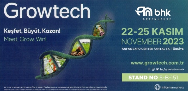 BHK Greenhouse is pleased to welcome you, our valued visitors, at stand 5-B-151 at the Antalya Growtech Greenhouse Fair. We welcome you to our stand at the greenhouse fair, which will be held between 22-25 November 2023, to inform you about the solutions we will produce for your sector-related consultations and demands.