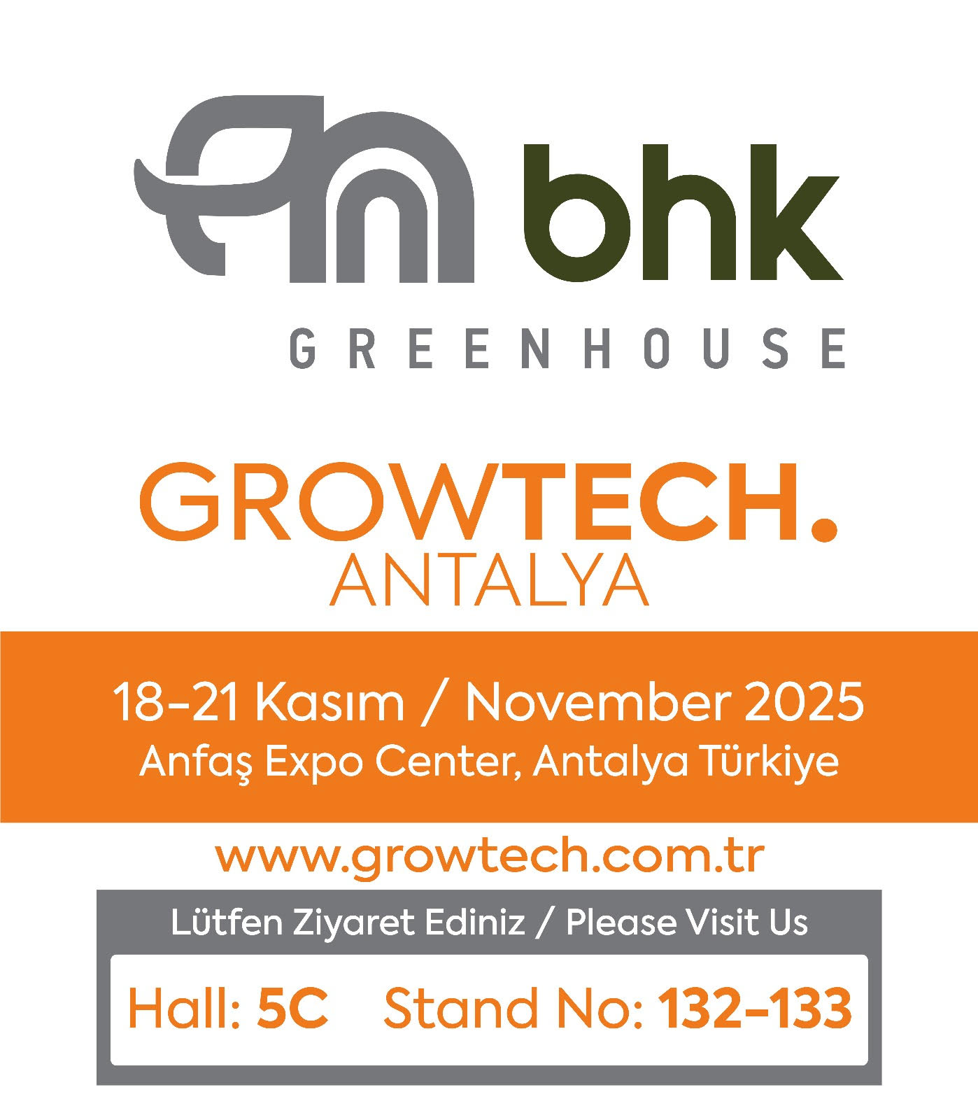 18-21 Kasım tarihlerinde gerçekleşecek olan Growtech Antalya Tarım Fuarı’nda BHK Greenhouse olarak 5C/132-133 no’lu standımızda siz değerli ziyaretçilerimizi ağırlamaktan mutluluk duyarız.